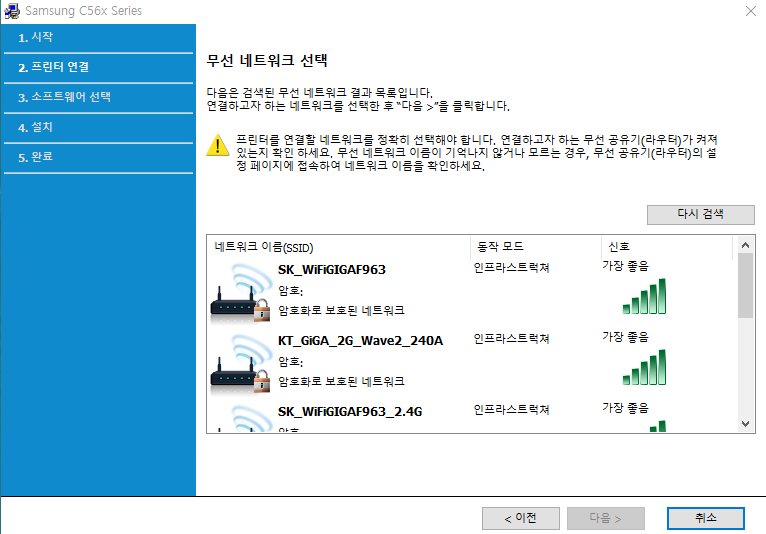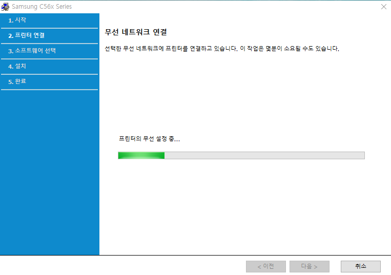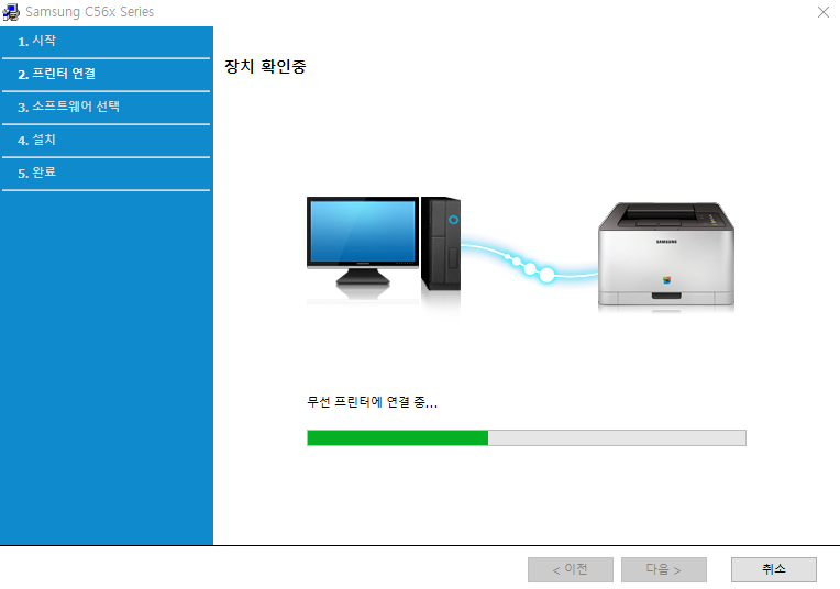 USB 연결없이 무선 프린터를 찿아서 설정하는 환경입니다.