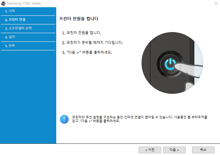 프린터의 전원은 켜있어야 하며, 그 외에는 다른 버튼을 누르지 않으셔도 됩니다. 이유는 프린터가 기본값으로 WPS - 와이파이 환경을 사용한다는 것을 기본으로 한답니다.
