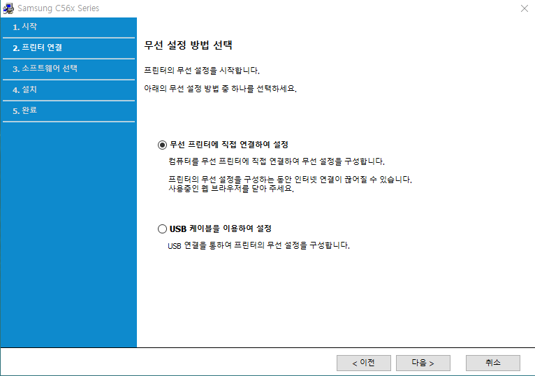 USB연결 없이 네트워크로 프린터 찾아서 설치하는 것이라서 무선을 선택합니다.