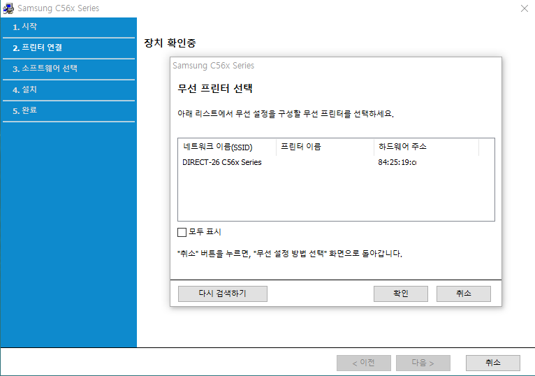 네트워크 이름에 자동으로 프린터가 검색이 된 것이 보이시죠? 이유는 삼성기기끼리의 와이파이 다이렉트기능으로 장치까지는 검색이 됩니다. 요기까지 오셨다면 확인 누르고 설치하시면 끝입니다. 너무 간단하게 설치가 됩니다.