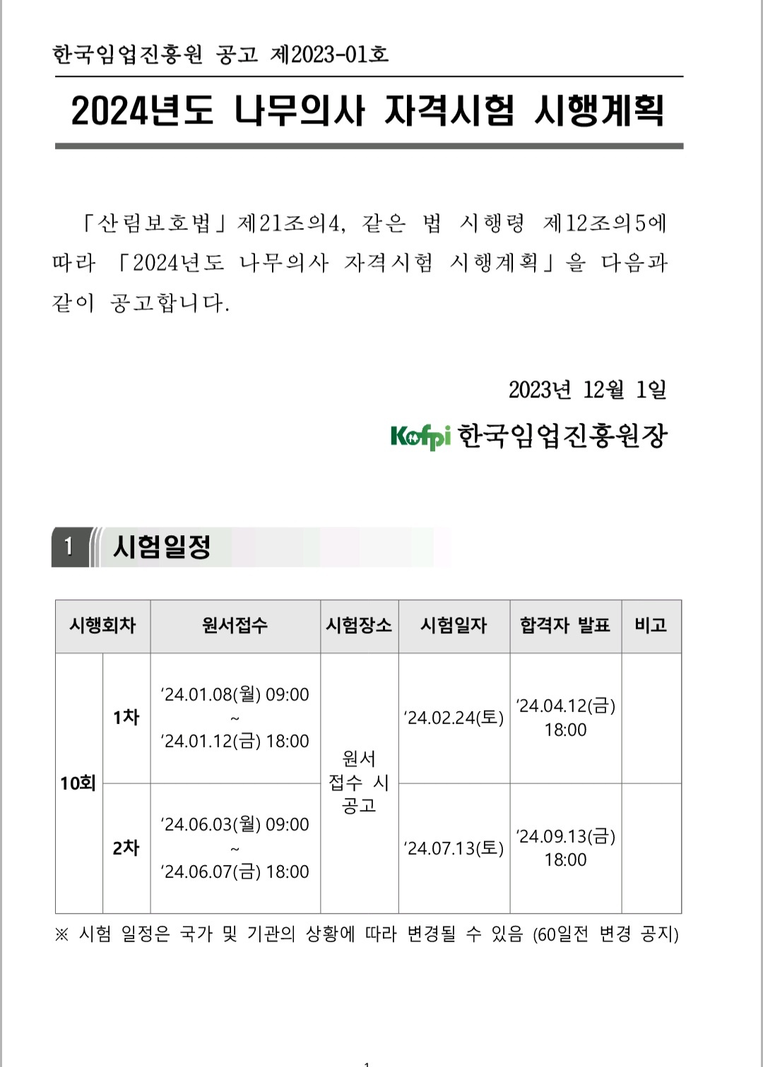 2024년도 나무의사 자격시험 시행계획이 발표되었네요. 10회 시험의 날짜배정은 1차 시험이 2월, 2차 시험이 7월로 시험 날짜로만 보았을 때는 간격이 아주 괜찮아 보이네요.