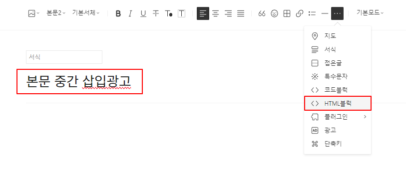 글쓰기에서 html 블록으로 위에서 생성해서 만든 광고 스크립트를 넣으시면 되는데요. 매번 글을 쓸 때마다 넣기가 매우 번거롭습니다. 아래의 캡처는 이렇게 사용하는 것이구나 이해만 하시고 잊어주시면 되겠네요.
