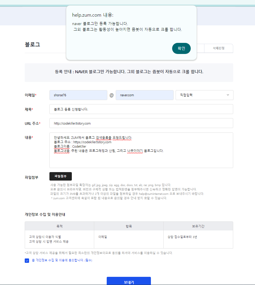 역시나 되지 않네요. ZUM에서는 네이버 블로그만 신규등록이 가능하며, 다른 블로그들의 경우는 활동성이 높아지면 ZUM봇이 크롤 한다고 하네요.