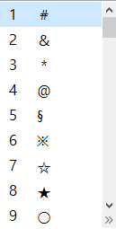 | ㅁ+한자키 # & * @ § ※ ☆ ★ ○ ● ◎ ◇ ◆ □ ■ △ ▲ ▽ ▼ → ← ↑ ↓ ↔ 〓 ◁ ◀ ▷ ▶ ♤ ♠ ♡ ♥ ♧ ♣ ⊙ ◈ ▣ ◐ ◑ ▒ ▤ ▥ ▨ ▧ ▦ ▩ ♨ ☏ ☎ ☜ ☞ ¶ † ‡ ↕ ↗ ↙ ↖ ↘ ♭ ♩ ♪ ♬ ㉿ ㈜ № ㏇ ™ ㏂ ㏘ ℡ ª º |