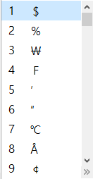 ㄹ+한자키 $ % ₩ F ′ ″ ℃ Å ¢ £ ¥ ¤ ℉ ‰ ㎕ ㎖ ㎗ ℓ ㎘ ㏄ ㎣ ㎤ ㎥ ㎦ ㎙ ㎚ ㎛ ㎜ ㎝ ㎞ ㎟ ㎠ ㎡ ㎢ ㏊ ㎍ ㎎ ㎏ ㏏ ㎈ ㎉ ㏈ ㎧ ㎨ ㎰ ㎱ ㎲ ㎳ ㎴ ㎵ ㎶ ㎷ ㎸ ㎹ ㎀ ㎁ ㎂ ㎃ ㎄ ㎺ ㎻ ㎼ ㎽ ㎾ ㎿ ㎐ ㎑ ㎒ ㎓ ㎔ Ω ㏀ ㏁ ㎊ ㎋ ㎌ ㏖ ㏅ ㎭ ㎮ ㎯ ㏛ ㎩ ㎪ ㎫ ㎬ ㏝ ㏐ ㏓ ㏃ ㏉ ㏜ ㏆ |