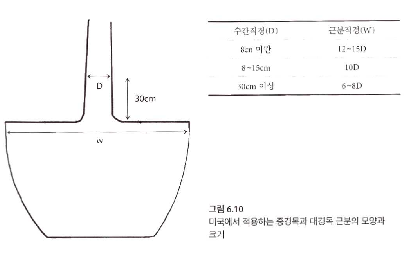 - 대부분의 뿌리는 표토에서 75cm 깊이 이내에 존재하기 때문에 근분의 높이를 직경에 비례해서 제작할 필요는 없음.