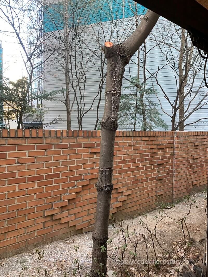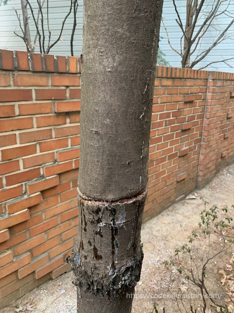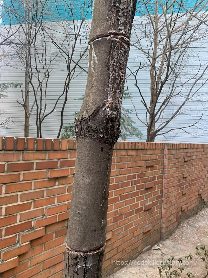 현재는 현수막 줄을 제거를 해서 어떤 현수막이었는지 모르는 상황인데요. 현수막만 있었어도 찿아서 신고하고 싶어 지네요. 윗부분과 아랫부분을 줄로 옥죄어 시기가 더 흘렀다면 아마 형성층파괴로 고사했을 텐데, 아직은 살아 있어서 다행입니다.