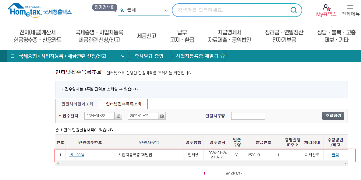 (5) 처리가 즉시 끝나며, 바로 발급된 사업자등록증을 출력해서 사용하시면 됩니다.