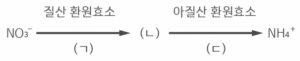 66. 나자식물의 질산환원 과정이다. (ㄱ), (ㄴ), (ㄷ)에 들어갈 내용을 순서대로 옳게 나열한 것은?
