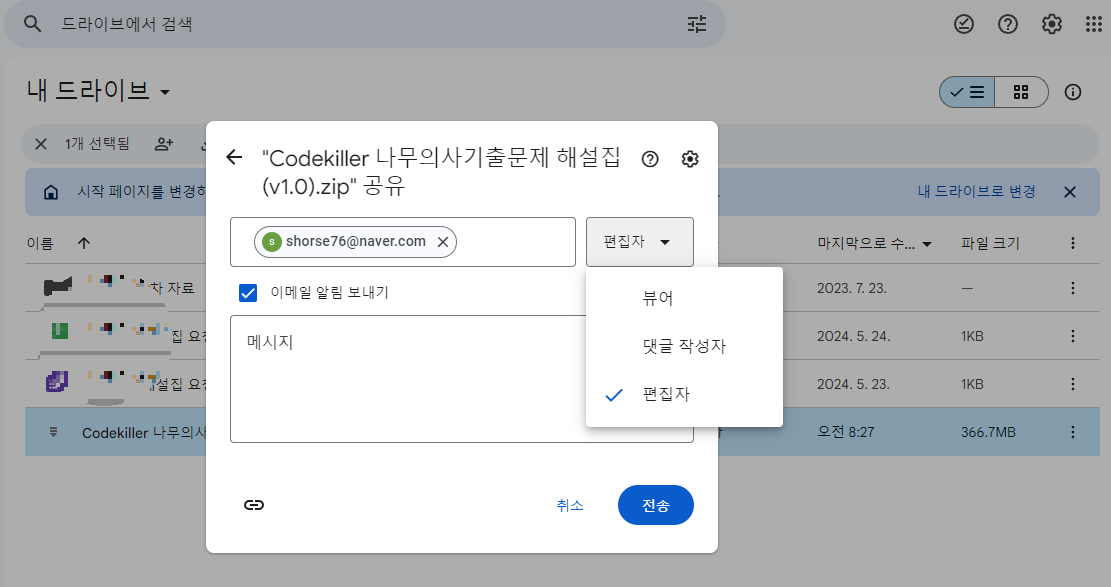 아래는 이메일주소가 입력이 되고, 공유를 받는 사람에게 주어지는 권한 및 메시지에 대한 팝업입니다.