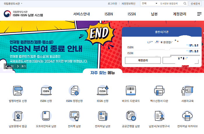 이름은 참 생소하지만, 알고보면 국립중앙도서관 ISBN, ISSN, 납본시스템이랍니다. 로그인을 위해 계정등록을 진행 후 첫 화면입니다. (출판자가 계정을 신청하려면 사업자와 출판신고증은 있는 상태이어야 하겠죠!) 책을 유통하려면 ISBN(국제표준도서번호)을 발급을 받아야 하는데요. 책마다의 고유번호라고 생각하시면 되고, 그 고유번호를 이용하여 쉽게 조회를 해볼 수 있는 시스템이랍니다.