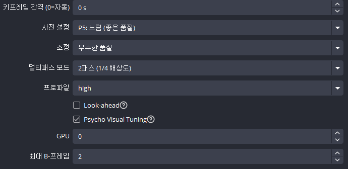 사전 설정 : P1 (가장 빠른 인코딩 속도 제공), P2~P3(인코딩은 느림, 품질은 좋음), P4~P5(중간정도 속도와 품질), P6(품질은 좋고, 인코딩 속도는 느림), P7(느린 속도, 최고 품질)
