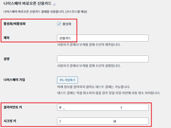 신용카드의 경우에는 장바구니에서 결제를 진행할 때, 신용카드 항목이 보여야 하므로, 활성화에 체크하시고 텍스트는 "신용카드"로 작성하신 뒤, 타인에게 노출되면 안 되는 클라이언트키와 시크릿키를 설정합니다.
