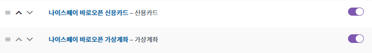 우커머스 설정에서 가장 중요한 부분이 아닐까 싶은데요. 먼저 PG사 신청시에 상품페이지에 보이고 싶은 결제수단을 활성화합니다. 제 경우는 신용카드와 가상계좌 두가지를 활성화하였습니다. (실시간 계좌이체의 경우는 설치되는 것들이 많아서 매우 복잡하고 이로 인한 문의가 많을 수 있으므로 사용하지 않았습니다.)