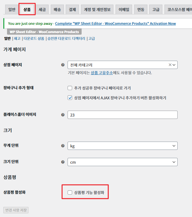 우커머스 일반탭에서는 일반적인 주소와 우편번호 등을 설정하는데요. 그중에서 중요한 것은 "세율 및 계산 활성화"에 체크해두시는 것을 추천드립니다.