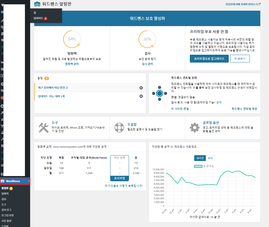 워드펜스 메뉴에서는 워드펜스 대시보드 기능으로 방화벽 관리, 방화벽 규칙 설정, 실시간 IP차단 기능, 무차별 대입공격 등에 대해서 대처를 할 수 있으며 보호수준을 지정하거나 실시간 IP를 차단함으로써 문제해결을 해나갈 수 있습니다. 워드펜스 프리미엄 사용자는 아니지만, 워드펜스의 옵션 및 기능에 만족하고 있습니다.
