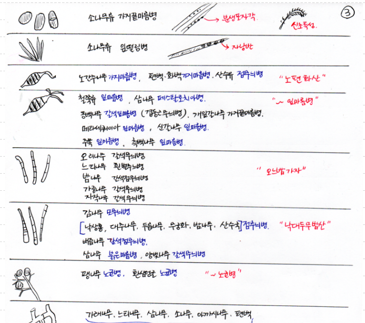 문제에서는 삼나무라는 제시어를 주어서 쉽게 삼나무 잎마름병이라는 것을 유추해 볼 수 있지만, 병원체 모양을 그림으로 그려서 암기했던 기억이 있는데요. 간단하게라도 그려보시면 도움이 많이 됩니다.