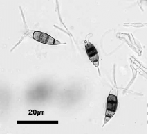 25. 삼나무 아랫가지의 잎이 회백색으로 변하고 검은 점들이 발견되었다 광학현미경기법을 사용하여 이 부분에서 아래 병원체를 관찰하였다. 이에 관한 설명으로 옳지 않은 것은?