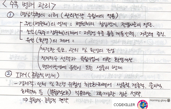 - 경제적.인체 및 환경 위험성 최소화하면서 생물적,경종적,물리적,화학적 등 복합적으로 적용하는 지속가능한 접근전략.