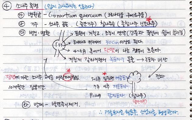 2. 기주 - 소나무, 곰솔, 중간기주는 참나무류 (졸참나무, 신갈나무) [암기 : 혹졸신]