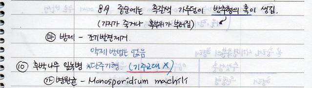(여름포자는 빗물이나 바람에 의해 전반되어 초가을까지 잎과 어린가지에 반복감염)