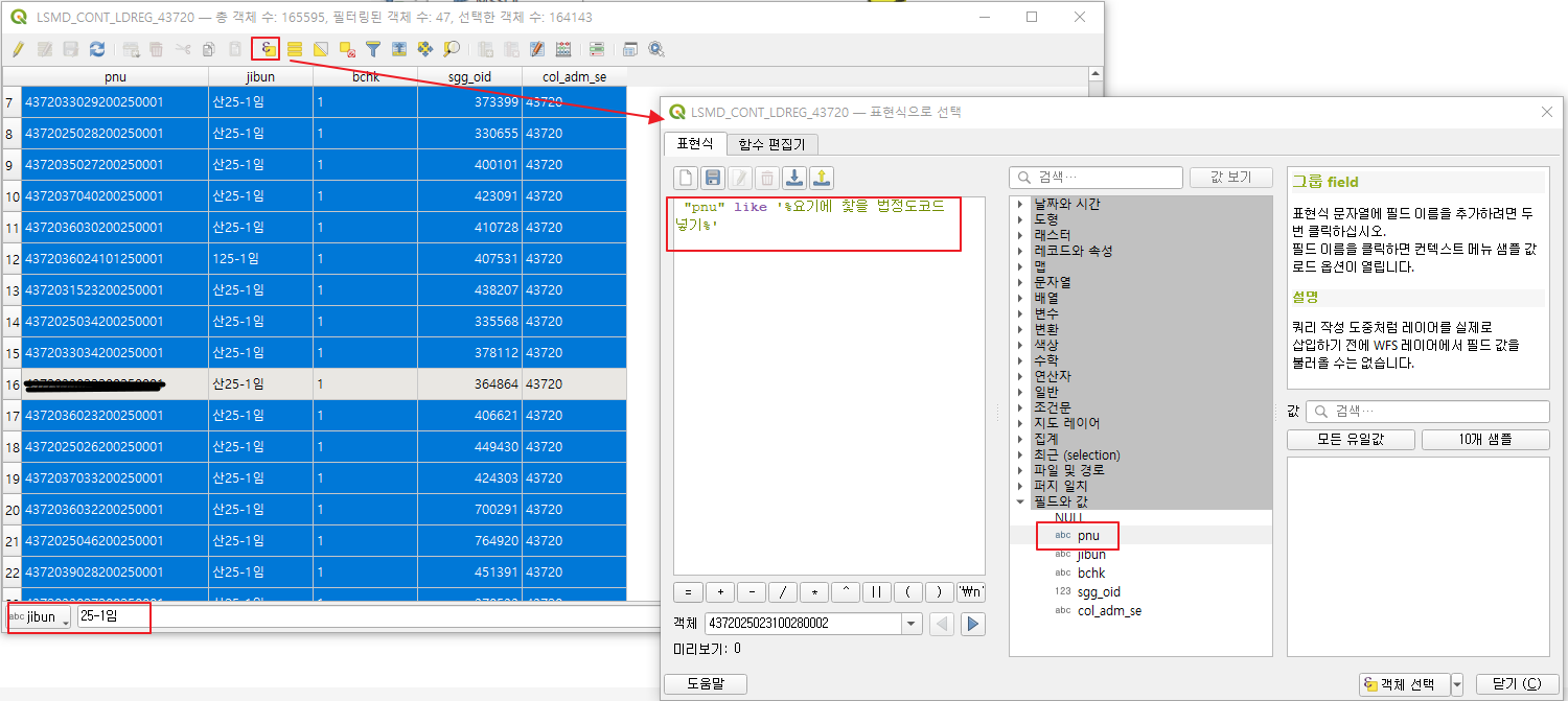 4. 속성테이블에서 "표현식을 이용하여 개체선택" 또는 하단의 combobox 를 이용하여 찿는 주소를 필터링한다.