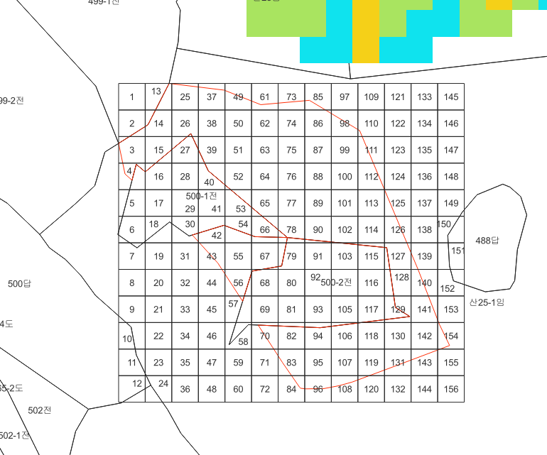 (1) 벡터 그리드를 생성하는 Layer가 선택가능한 벡터 영역(Layer)이 존재할때 사용 가능합니다. 선택가능한 영역이 지역의 전체라면 도면 전체에 그리드가 꽉 채워지게 됩니다.