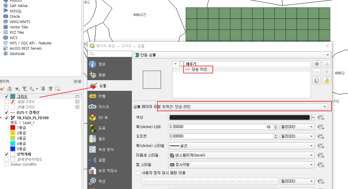 (2) 심볼의 레이어 유형을 원하시는 유형으로 변경, 저같은 경우는 면이 아닌 "단순라인"으로 변경하였습니다.