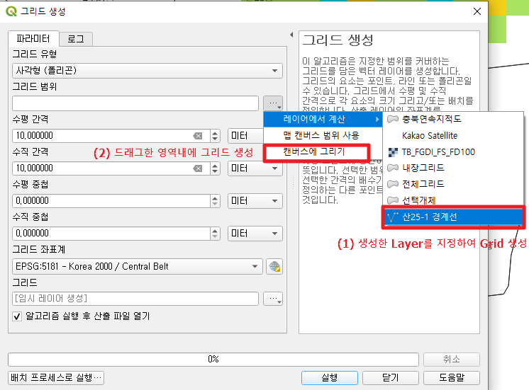 (2) 그리드를 그리려는 SHP Layer 영역이 없다면 캔버스에 영역을 드래그하여 지정할 수 있습니다.