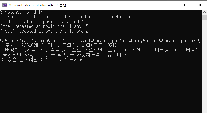 Console.WriteLine("{0} matches found in:\n {1}", matches.Count, text);