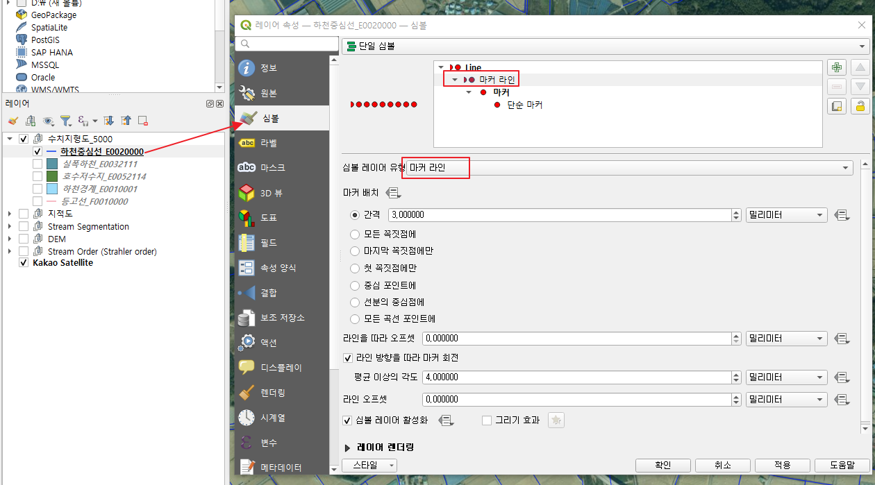 2. 하천중심선의 속성 - 심볼 - 단일심볼 - 심볼레이어 유형을 마커라인으로 변경