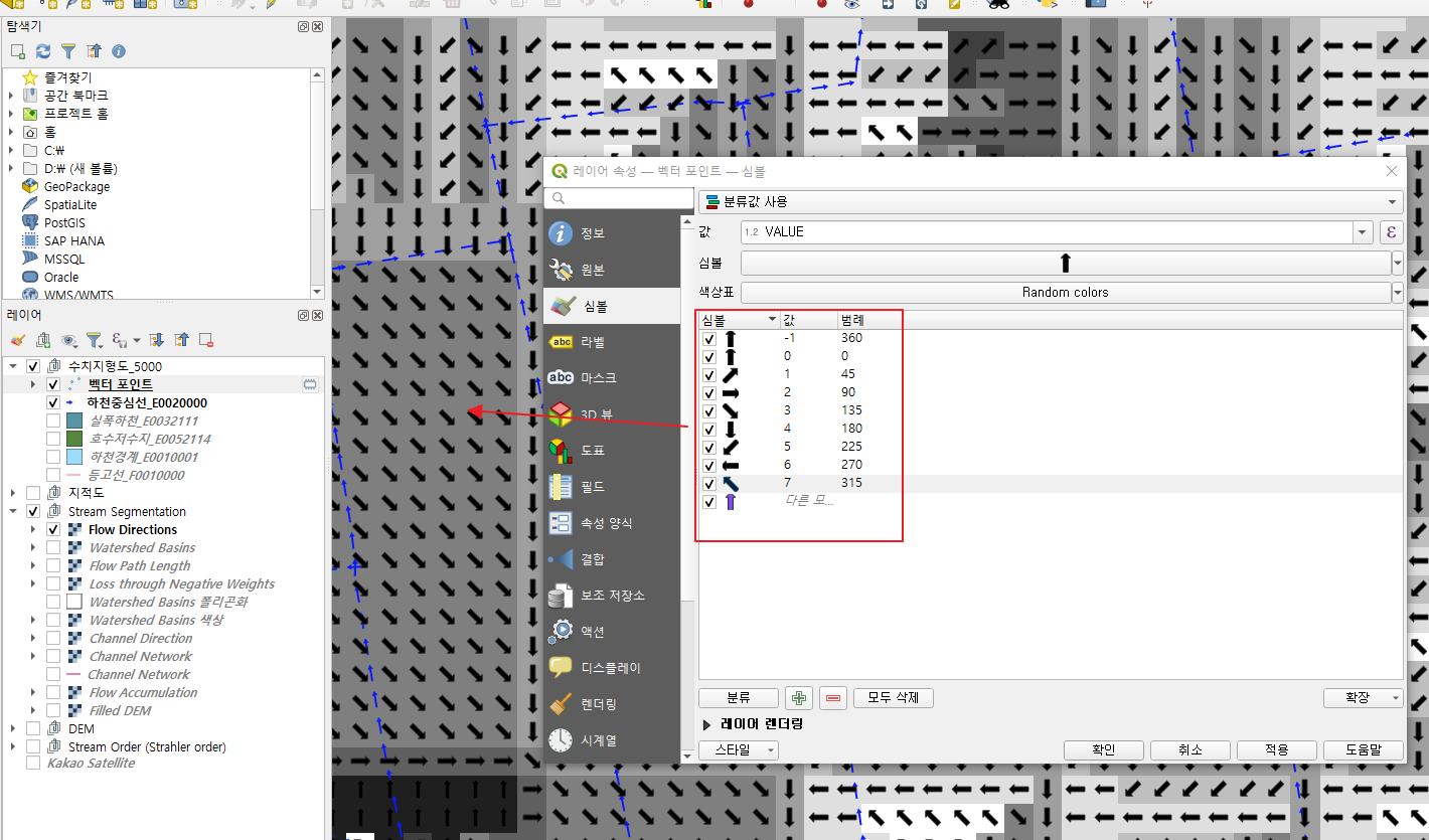 위의 두 가지 기능을 기반으로 Flow Direction을 화살표로 표현하기를 해보겠습니다.