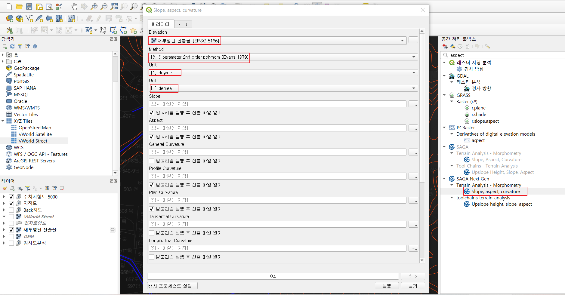 2. 공간처리툴박스에서 Slope, aspect, curvature를 띄웁니다.