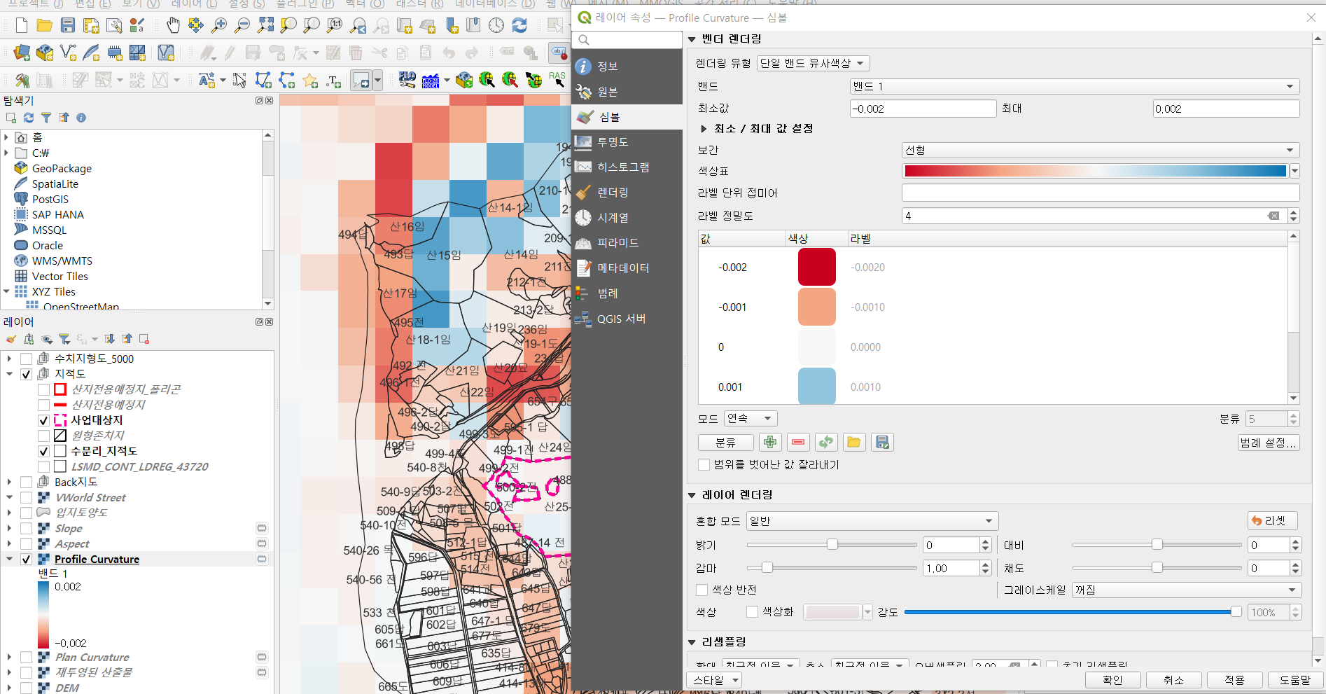 4. Profile curvature 레이어로 "오목"(붉은색 계열), "볼록"(파란색 계열)을 확인합니다.