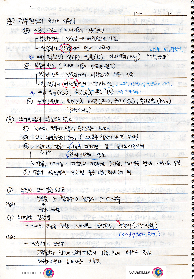 - 질소, 인, 칼륨 : 가을이 다가오면 잎 → 줄기로 이동시켜 잎의 함량이 감소