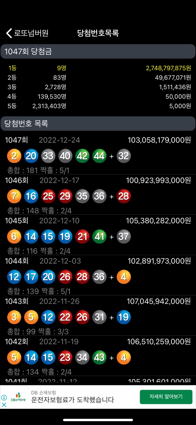 [로또] 1047회 당첨번호(2,20,33,40,42,44+32)