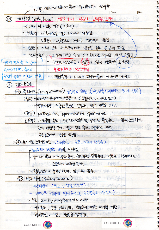 폴리아민(polyamines) (긍정적인 측면) (참고) 아미노산과 유사하게 생겼으나 (식물체는 다 가지고 있고) 어떤 학자 들은 식물호르몬으로 인정하지 않는 사람도 있음 (종류) putrescine, spermidine, spermine (특징) 세포분열촉진, DNA와 RNA 및 단백질 합성촉진, 잎의 노화방지, 막의 안정성 유지, 열매 성숙 촉진, 스트레스 내성, 높은 농도에서 반응을 일으킴