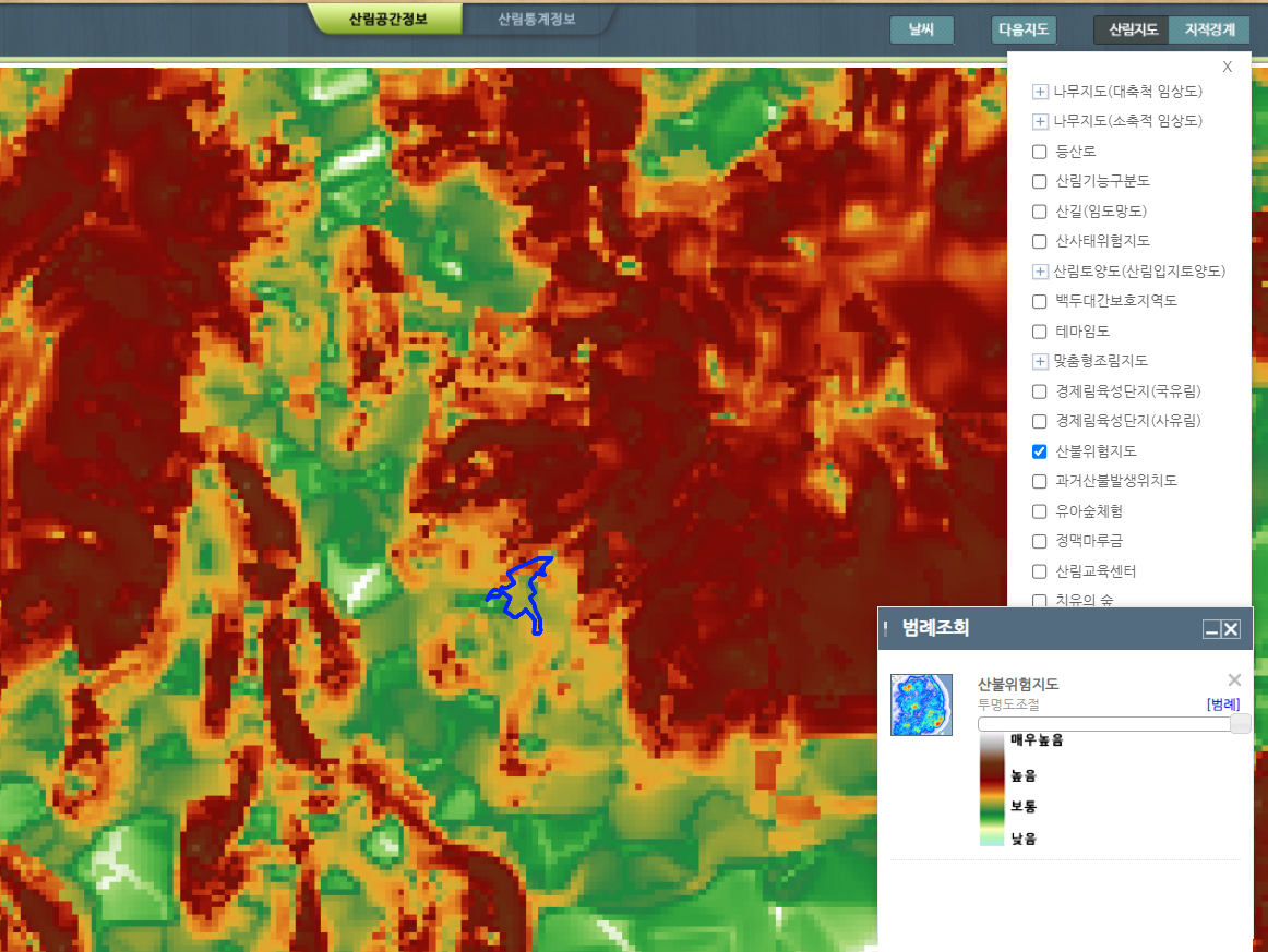 산림공간정보서비스에서 상단메뉴 "산림지도" - 산불위험지도를 선택합니다.