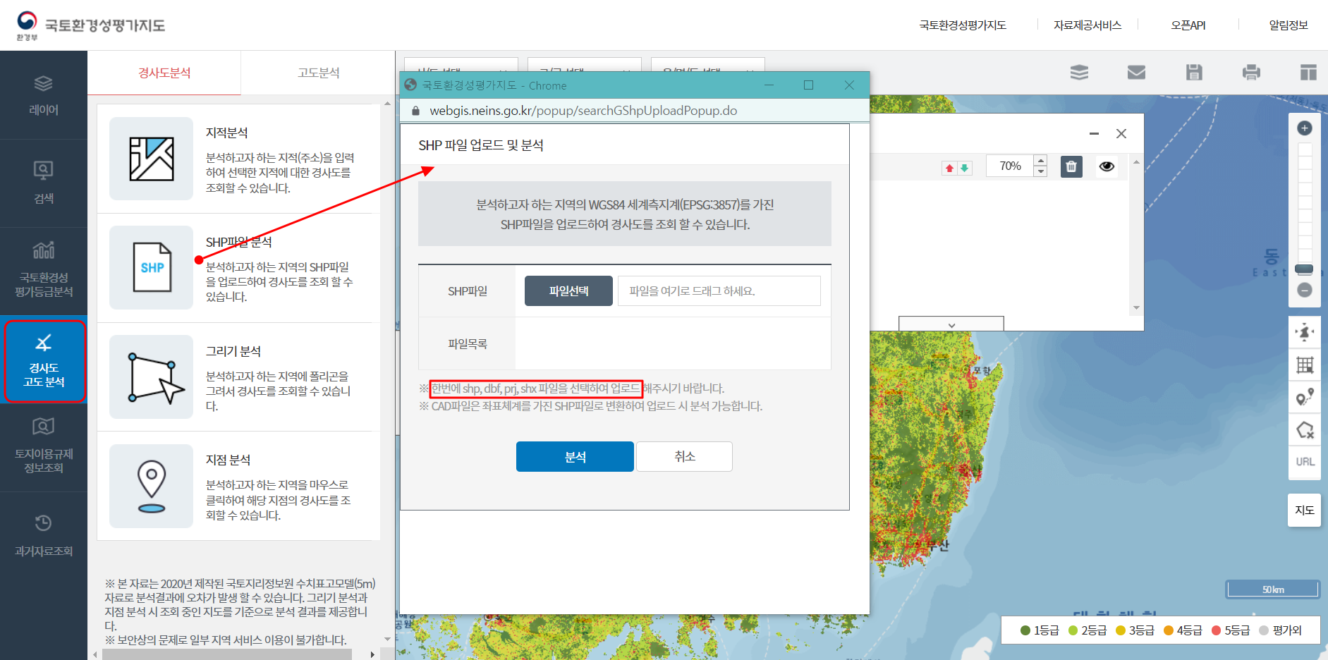 경사도 고도분석 메뉴에 SHP파일 분석으로 진입합니다. 지적분석의 경우는 지적(지번)을 활용하여 분석이 가능합니다.
