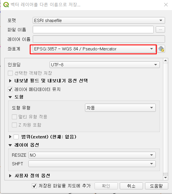 4. QGIS로 SHP파일을 생성할 때, 좌표계는 아래의 캡처에서와 같이 EPSG:3857로 세팅을 해야 합니다.