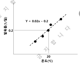 48. 어떤 곤충의 온도(x)에 따른 발육률(y)은 아래와 같이 추정되었다. 아래 그래프를 보고