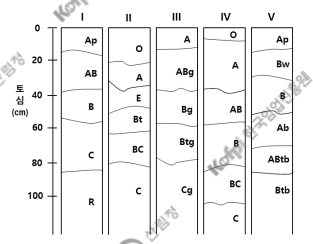 ① I: 경운 토양으로 A 층이 B 층으로 전환되는 전이(위)층이 있음 ② II: 용탈(세탈)층을 가진 토양 ③ III: 수분환경의 영향이 미약하여 강한 산화층이 발달한 토양 ④ IV: 지표 유기물의 분해가 빠르고 비교적 표토가 발달한 토양 ⑤ V: 매몰 이력을 가진 경운 토양