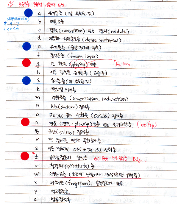 아래 스티커 붙어 있는 중요한 종속토층은 꼭 외우고 갑시다.^^ g:강 환원(gleying) 토층 i : 유기물층 (미 부숙된 것) p:경운(경작 : plowing) 토층 또는 인위교란층 (ex. Ap) t:규산염점토의 집적층 (ex. Bt) w:약한 B 층(토양의 색깔이나 구조상으로만 구별됨)