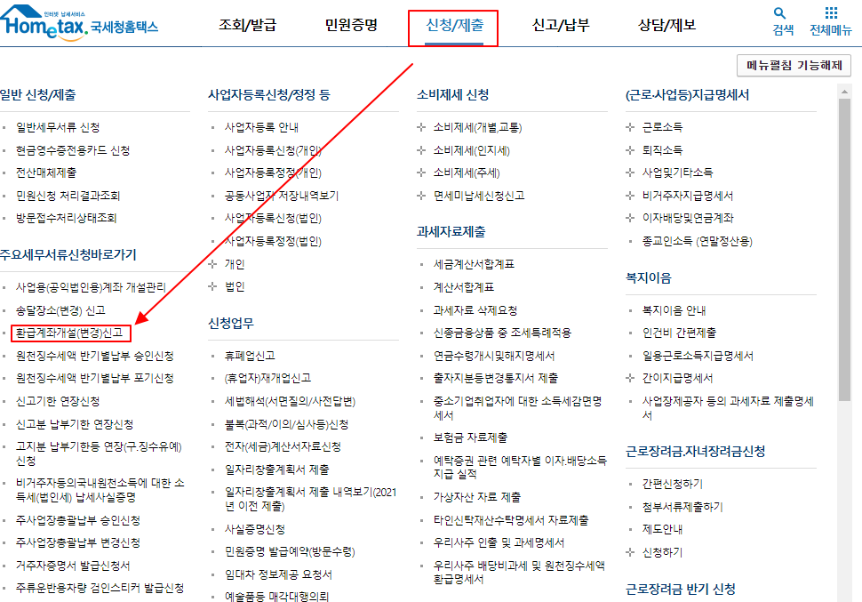 홈택스 > 신청/제출 > 환급계좌개설(변경) 신고