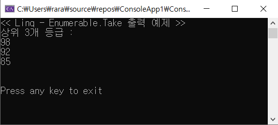 Console.Write("<< Linq - Enumerable.Take 출력 예제 >> \n");